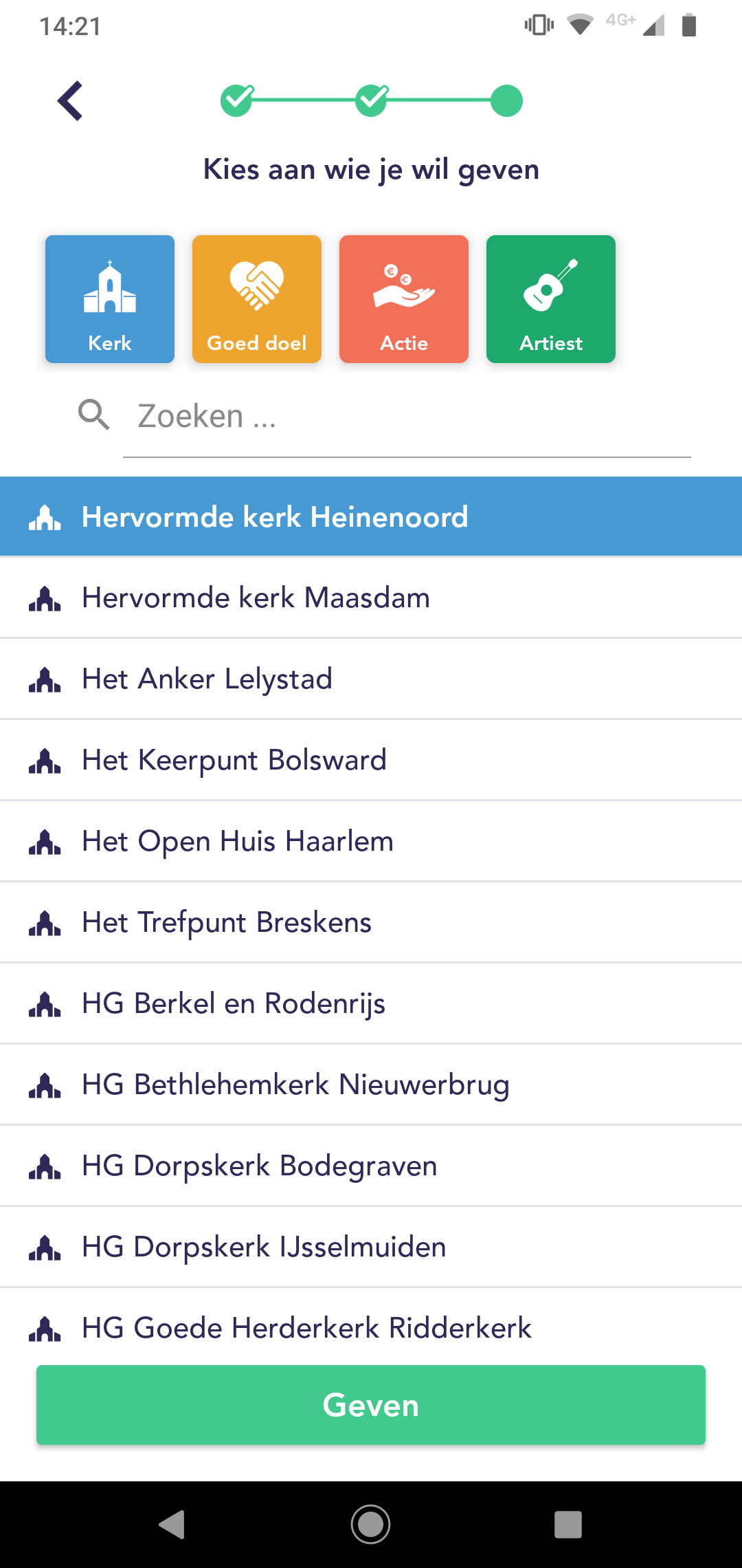 De manier van geven, kies voor de 3e optie ‘Lijst’ en zoek ‘Hervormde kerk Heinenoord’.